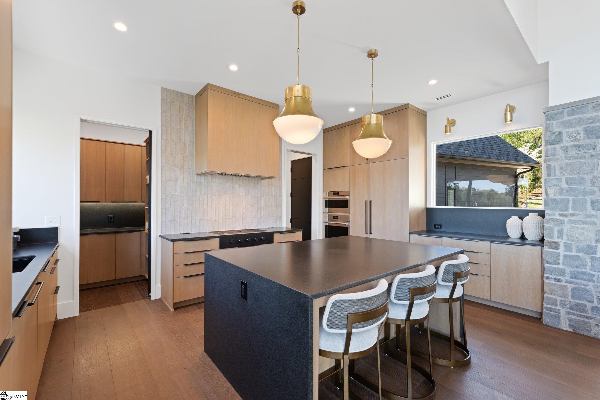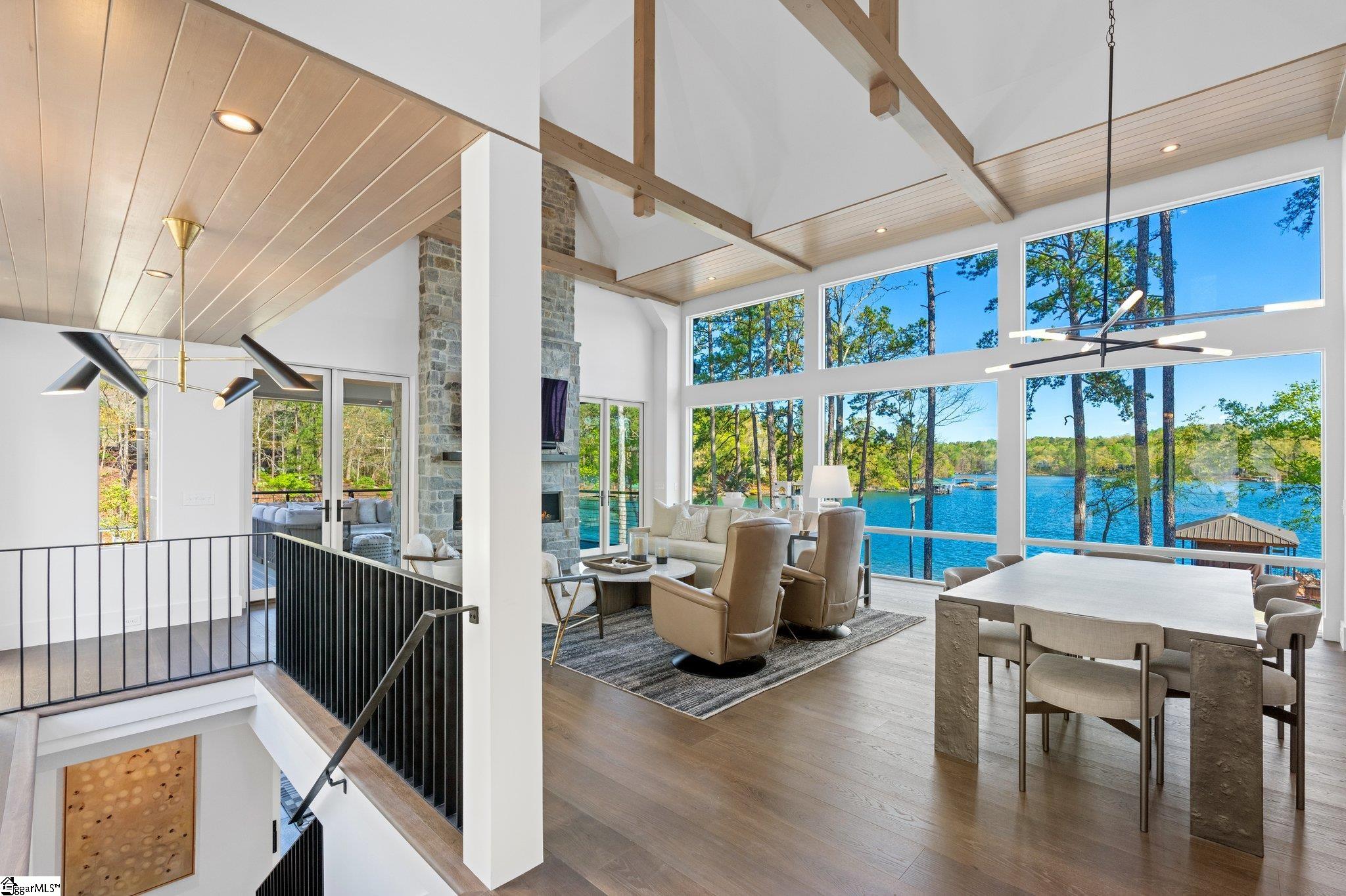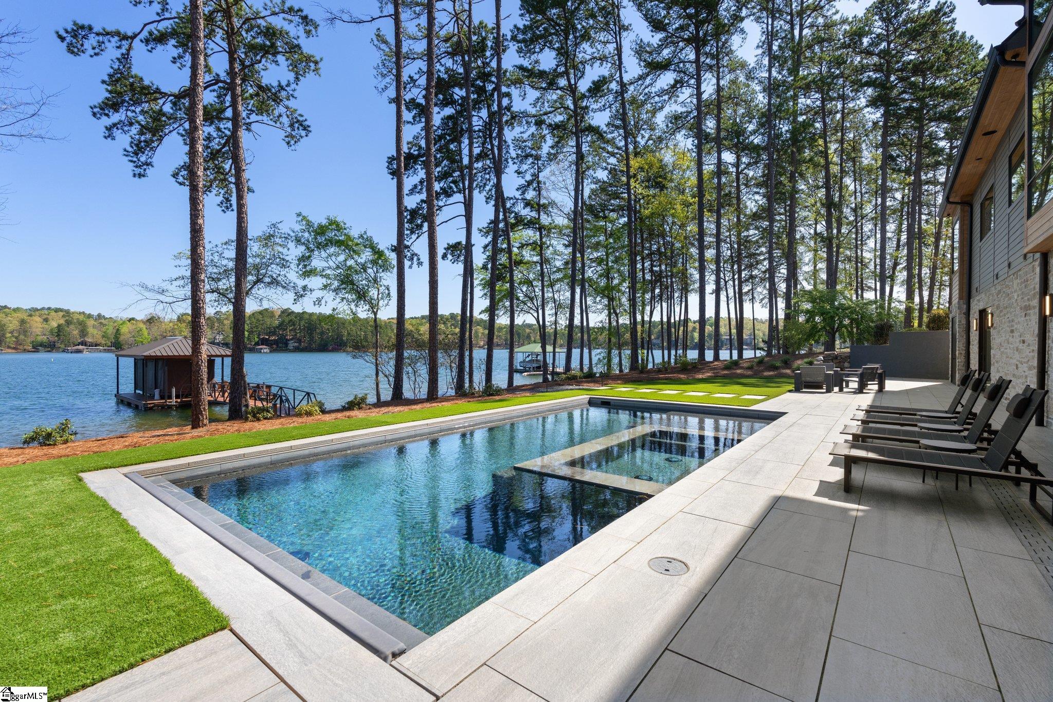Deep, rich exterior hues set the tone for this exceptional lakefront home. You'll immediately experience its modern aesthetic as you walk over the bridge to the front entrance. Inside, your first impression will likely be the striking vaulted ceilings with beautifully crafted, solid wood architectural beams. Contemporary comfort is an apt description for this standout dwelling designed by Scott Crichton of Architecture 224, decorated by In Site Designs, and landscaped by Graham Kimak Landscape Designs. Every detail from light fixtures to faucets exudes style, seamlessly blending everyday extravagance with aminimalist vibe. Touches of midcentury modern and Scandinavian sophistication characterize the perfect place to experience life on the lake, as the home showcases the water via its many sizeable windows. Another focal point is a striking stone accent that punctuates the airy living area with a built-in fireplace. Wide-plank smoked European oak floors imported from Italy contribute to the understated refinement of the main areas. In the kitchen, you'll find a large sleek island, a Subzero refrigerator, a Thermador coffee system, a Wolf double oven--convection and steam--and natural wood cabinets. Both the kitchen and the downstairs den feature Absolute Black honed granite countertops. Additionally, there are two ice machines downstairs, along with a wet bar. The home has four bedrooms (two on each floor), four full baths, and two half baths. The master bedroom, with its chevron-patterned flooring, delicate palette, and vaulted ceiling gives the feel of a peaceful vacation place, but you'll be right at home there. A cork floored room off the primary bedroom could be used for exercise or as an office. There are two laundry areas, and the bathrooms are appointed with TOTO toilets and Cambria countertops. Spanning the back of the home, the vast patio brings new meaning to the great outdoors; it's resort-worthy, and there is plenty of covered space for entertaining. The pool has a lock-in cover, and there's also a spa for the ultimate in relaxation. The property has a gentle grade to the lake where you'll enjoy 337feet of riprap waterfrontage with Oconee Prime rock and a Zuri decking dock by Kroeger Marine. There's also a HydroHoist lift and a Touchless Boat Cover(r). Constructed with solid wood timbers and doors, the home also has Hunter Douglas motorized blinds, exterior uplighting, tankless water heaters, a whole-house generator, and full-yard irrigation, which translates to convenience, energy efficiency, and worry-free maintenance. This homesite on a private cul de sac is located mid-Lake Keowee, allowing easy access to Clemson and Seneca. Make an appointment today to see this modern, lakeside treasure.